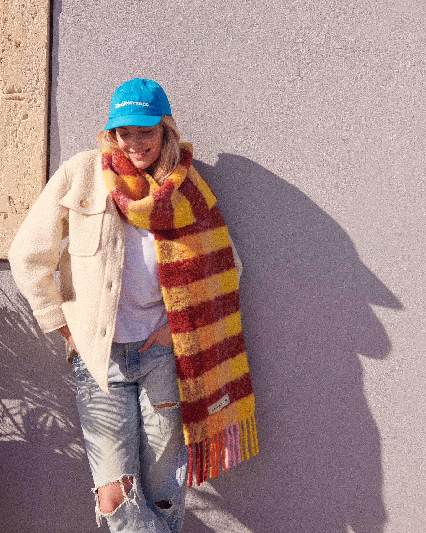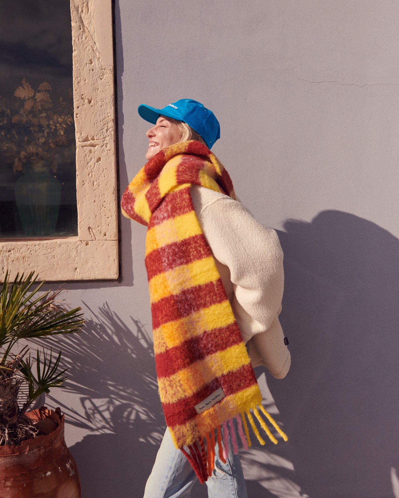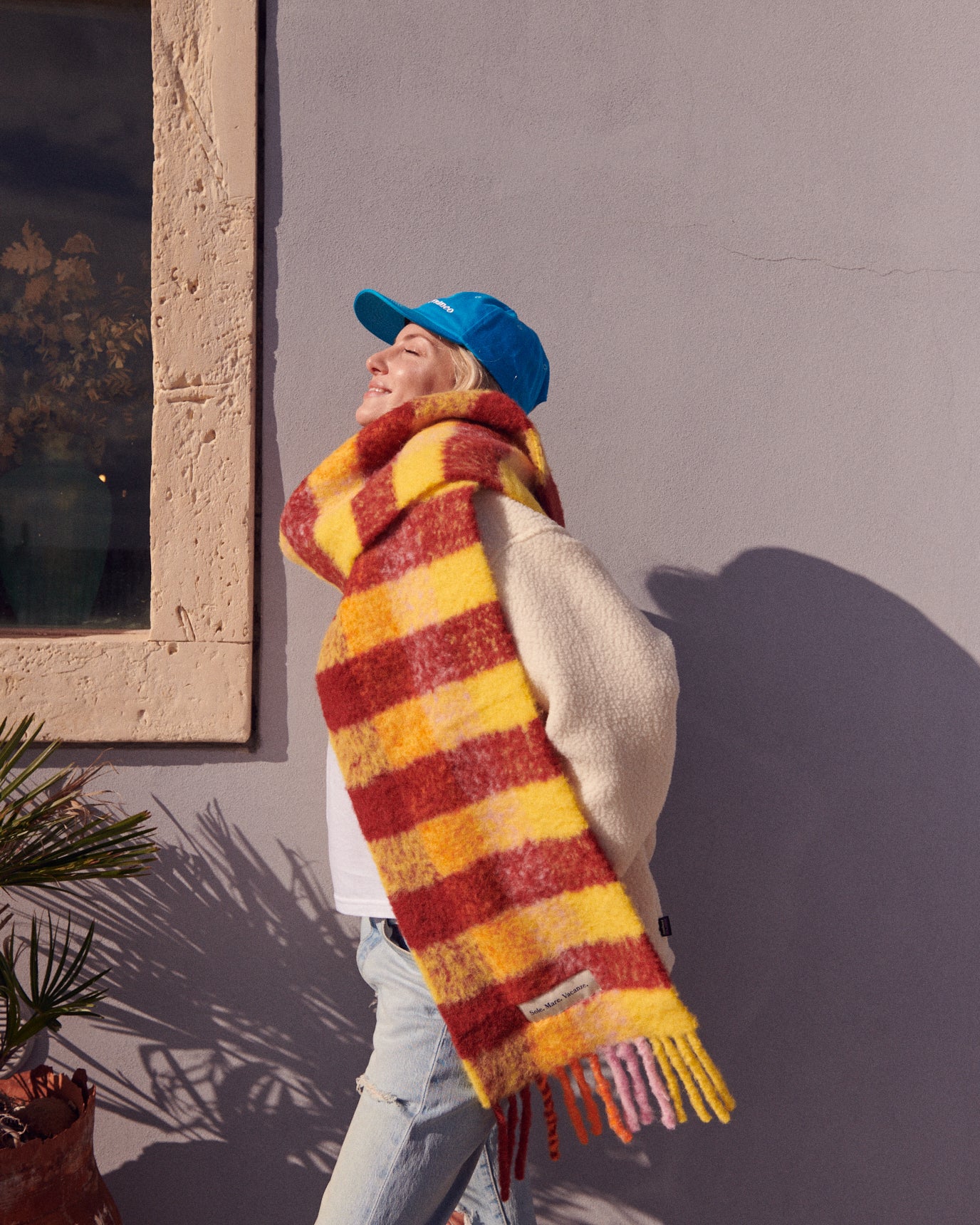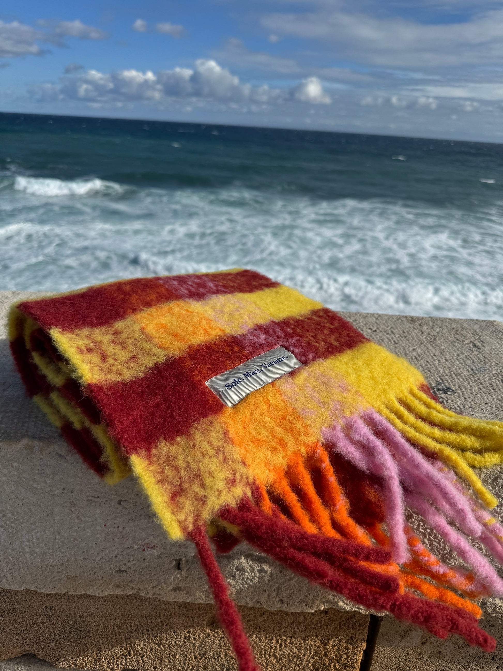 Gruby, mięciutki, puchaty i bardzo ciepły szalik z alpaki, (90 % alpaka), wyprodukowany w toskańskiej manufakturze. Żakardowe logo Sole Mare Vacanze. Nie gryzący, miły w dotyku. Produkt premium-najwyższa możliwa jakość. 30x250cm.